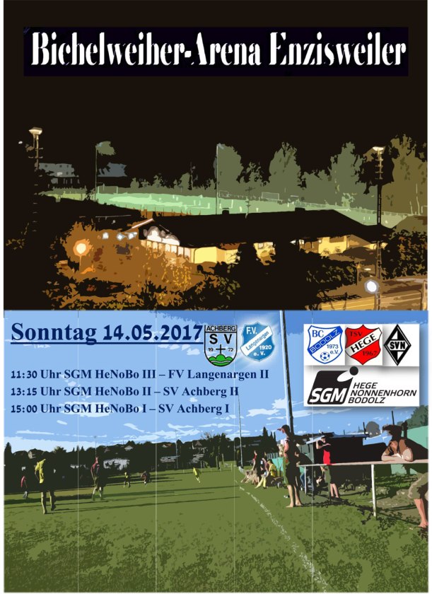 Diesen Sonntag treffen sich wieder viele motivierte Kicker auf dem Rasen der Bichelweiher-Arena in Enzisweiler zum Heimspieltag des BC Bodolz. Um 11:30 Uhr startet die SGM HeNoBo III-Mannschaft in den Spieltag mit ihrer Partie gegen den FV Langenargen II. Das nächste Spiel bestreitet die SGM HeNoBo II gegen die Gäste Achberg II. Abschluss des Spieltags ist die Partie der ersten Mannschaft gegen den Kontrahenten Achberg I.